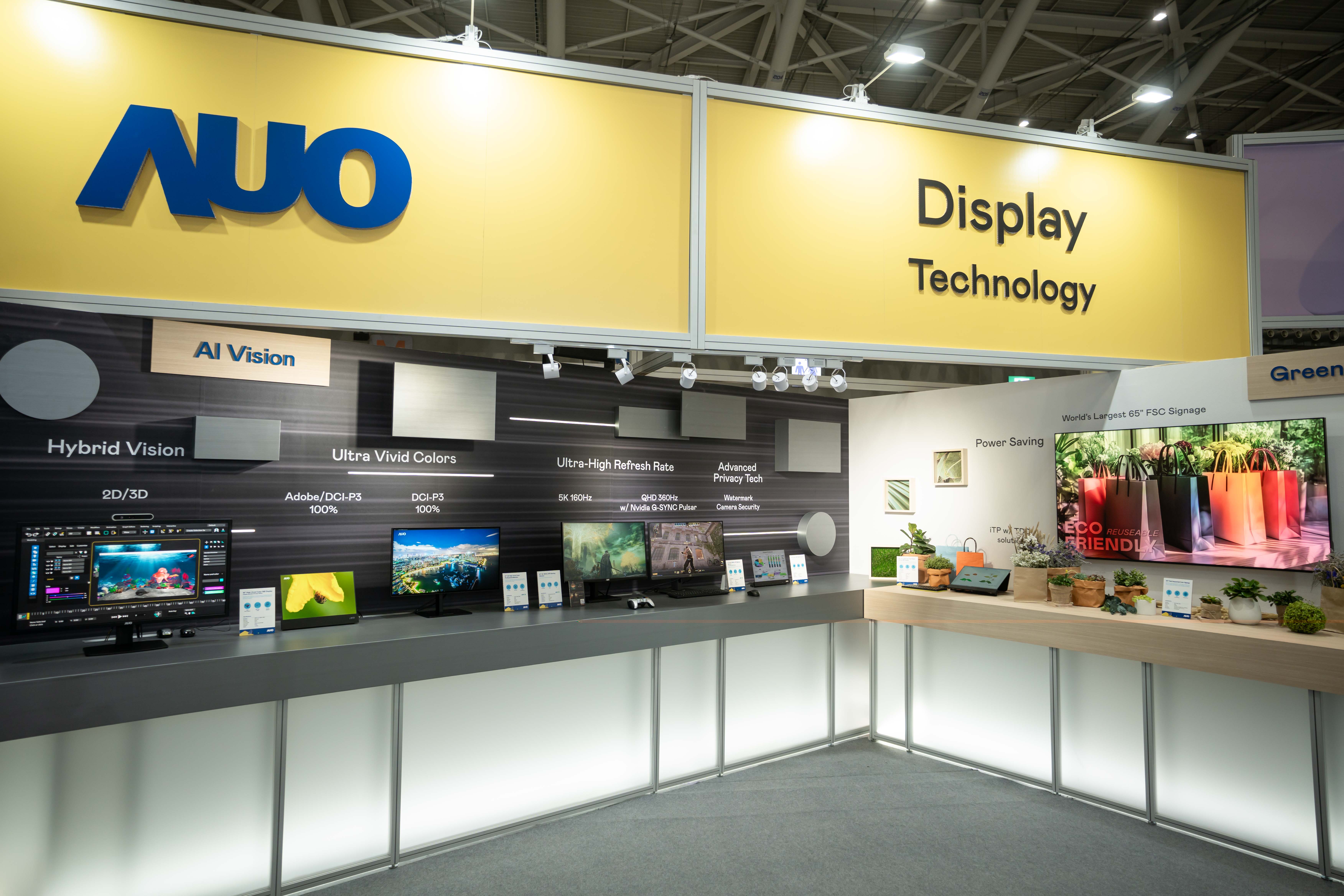 綠色科技的創新研發,面對液晶顯示器帶來的高能耗挑戰,FSC色序型顯示器(Field Sequential Color LCD, FSC-LCD)因不需使用彩色濾光片,可提高三倍背光利用率,具備高畫質、低能耗優勢。友達全球大尺寸高解析度節能、廣色域的65吋8K FSC色序型顯示器,採用新型液晶材料,融合超高頻刷新率、主動式RGB LED背光技術和AI優化的色分離演算法,實現低色分離和卓越的色域表現,成功解決過去FSC顯示器影像閃爍、視覺疲勞等問題,相較其他同尺寸顯示器,尺寸愈大愈省電,提升顯示效果同時助力推進數位低碳轉型。